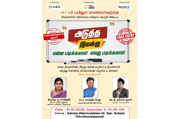 The “Aduththa Ilakku” (Career Guidance) programme was conducted in our school on 31.01.2026. Dr. K.Karthik Velu, Psychological Life Skill Trainer, and Mr. R. Ashok Kumar, Career Consultant, along with a team from an Engineering College, Chennai, guided the students to choose the correct courses in their higher education. Mr. N. Somasundaram, Management Representative, and Mr. S. Gajendiran, Principal of our school also participated in the programme. More than 1,500 students attended the programme and expressed that it was highly useful and provided proper guidance for their future careers.