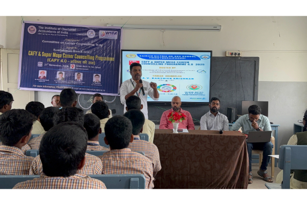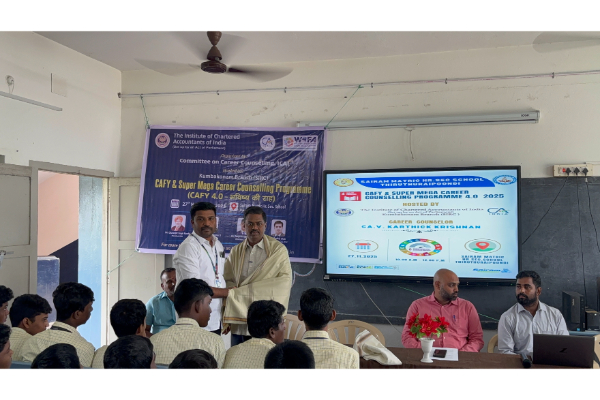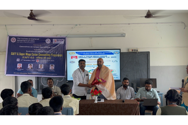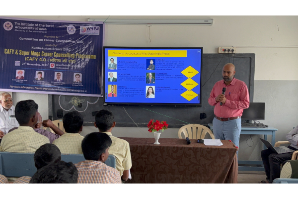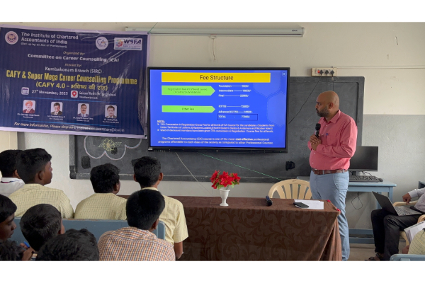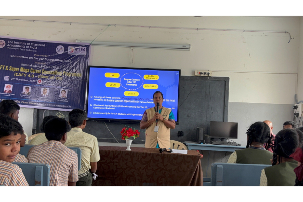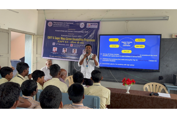 Career counselor CA V.Karthik Krishnan from Kumbakonam SIRC addressed the students and gave a comprehensive overview of the CA curriculum and course structure career oppurtunities and growth prospects, eligibility criteria and examination pattern. The session was highly beneficial for the students.
