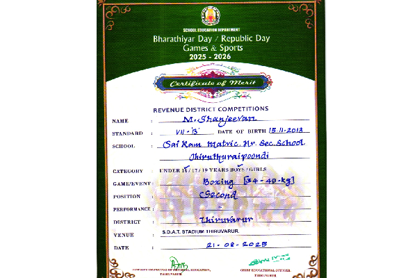 1 | SHANJEEVAN M | VII-B | UNDER-14 | II |