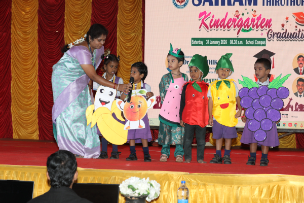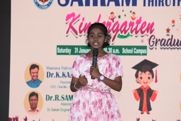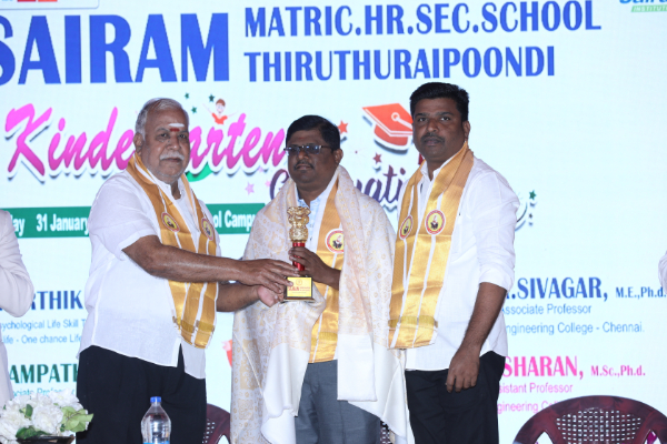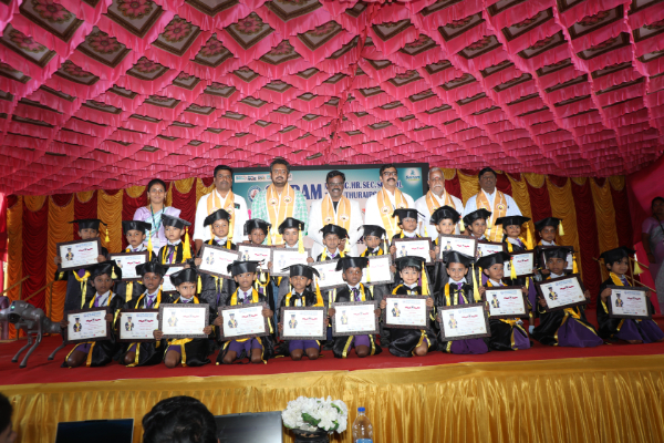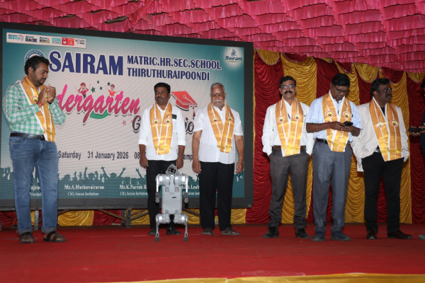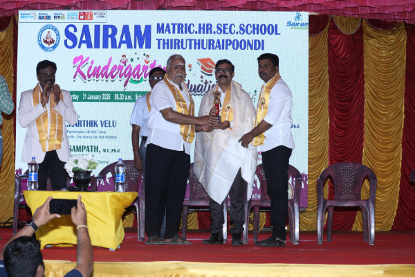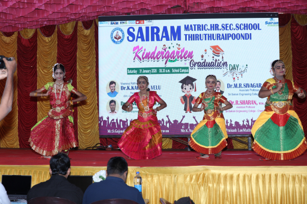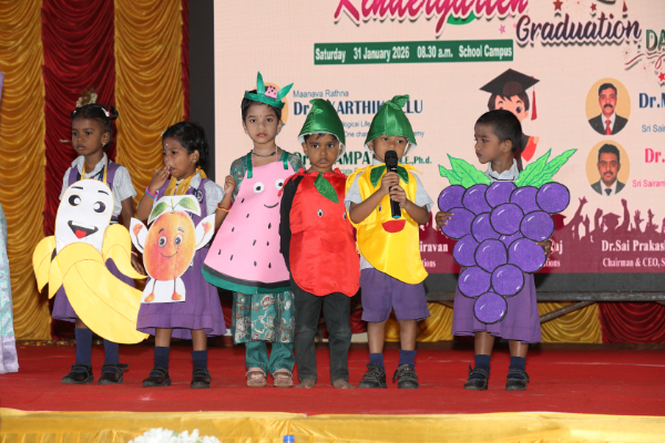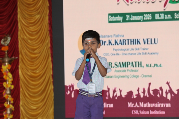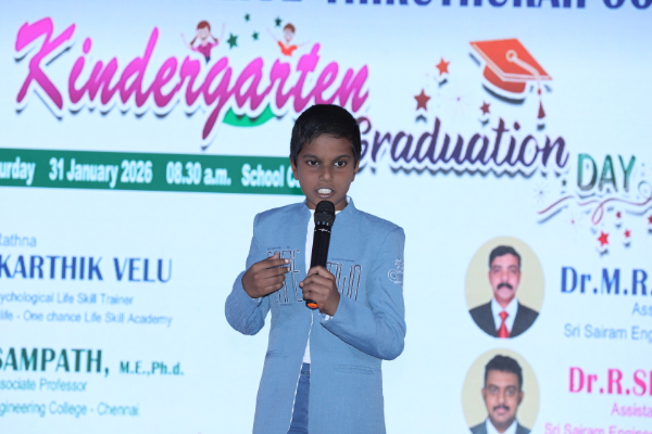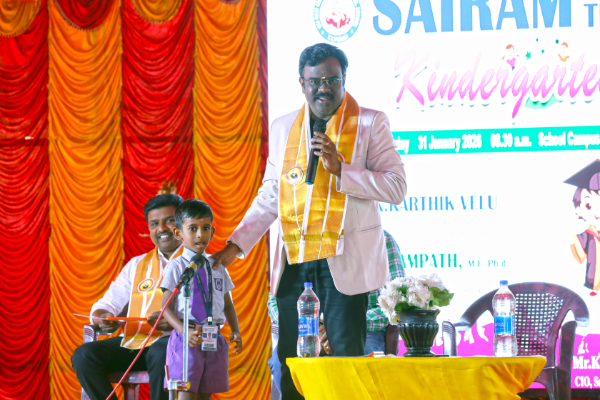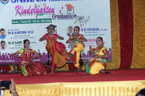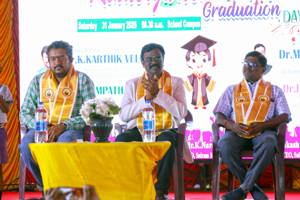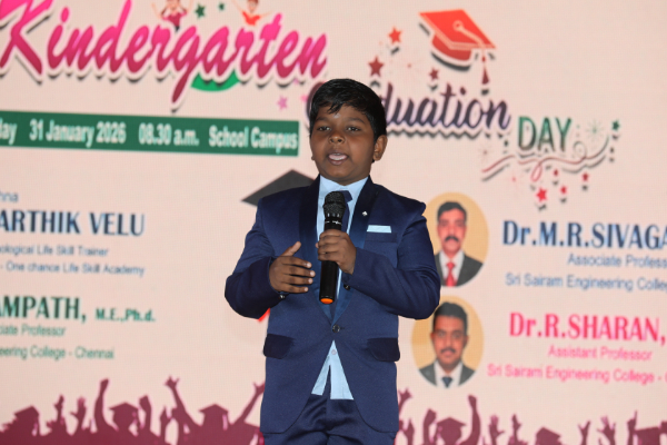 The Kindergarten Convocation Day was grandly celebrated in our school on 31.01.2026. The programme commenced with a Bharatanatyam performance. Maanava Rathna Dr. K. Karthik Velu, Psychological Life Skill Trainer, Dr. R. Sampath, Associate Professor, Dr. M. R. Sivagar, Associate Professor, and Dr. R. Sharan, Assistant Professor from the Sairam Group of Institutions were the Chief Guests. They felicitated the children and distributed degrees to the UKG students.