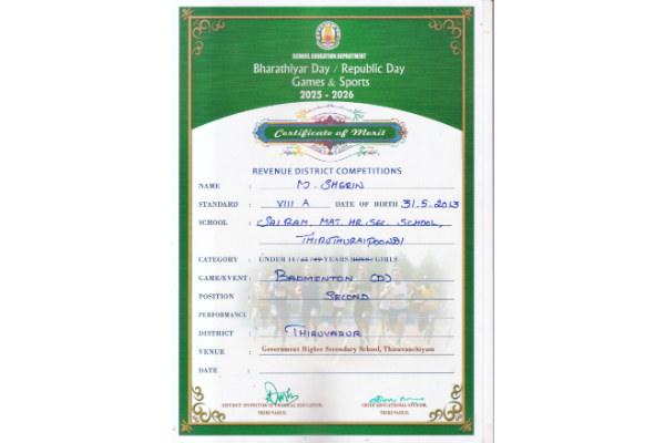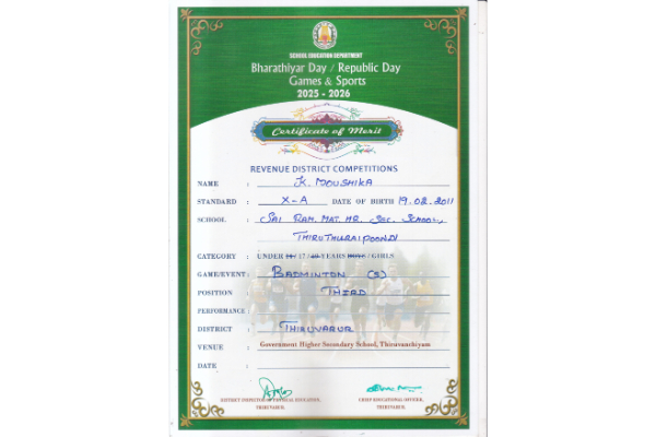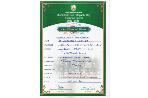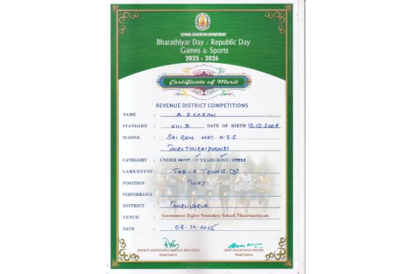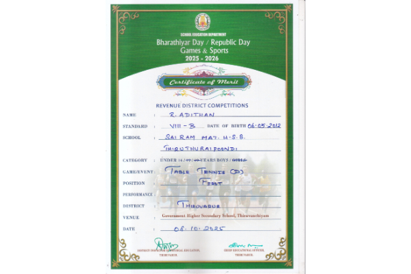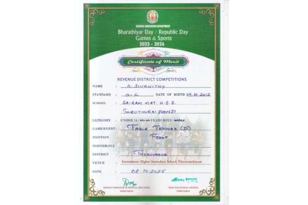 1.A. Sivanithy (IX C)Table TennisUnder 14 SingleDistrict WinnerSelected for State level Competition
